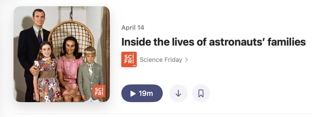 To hear more about my reflections on the two different space eras, especially about astronaut families, have a listen to my interview on the Science Friday podcast.